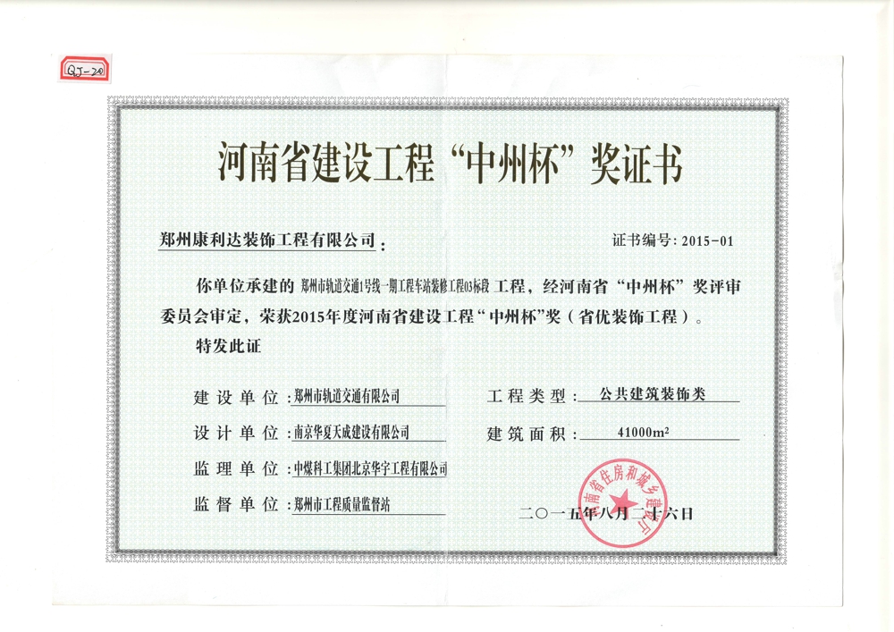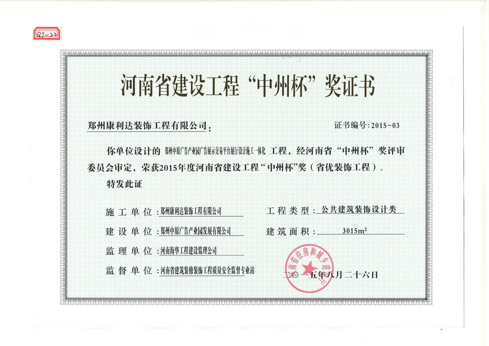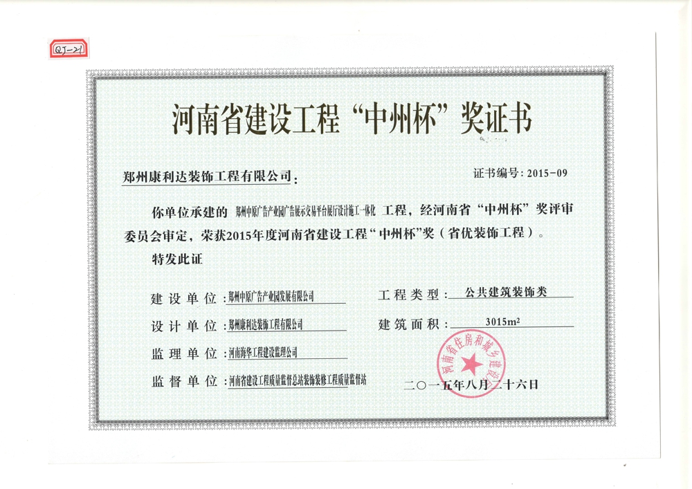 2007年9月 郑州国际会展中心装修Ⅳ标段工程获河南省建设工程“中州杯”