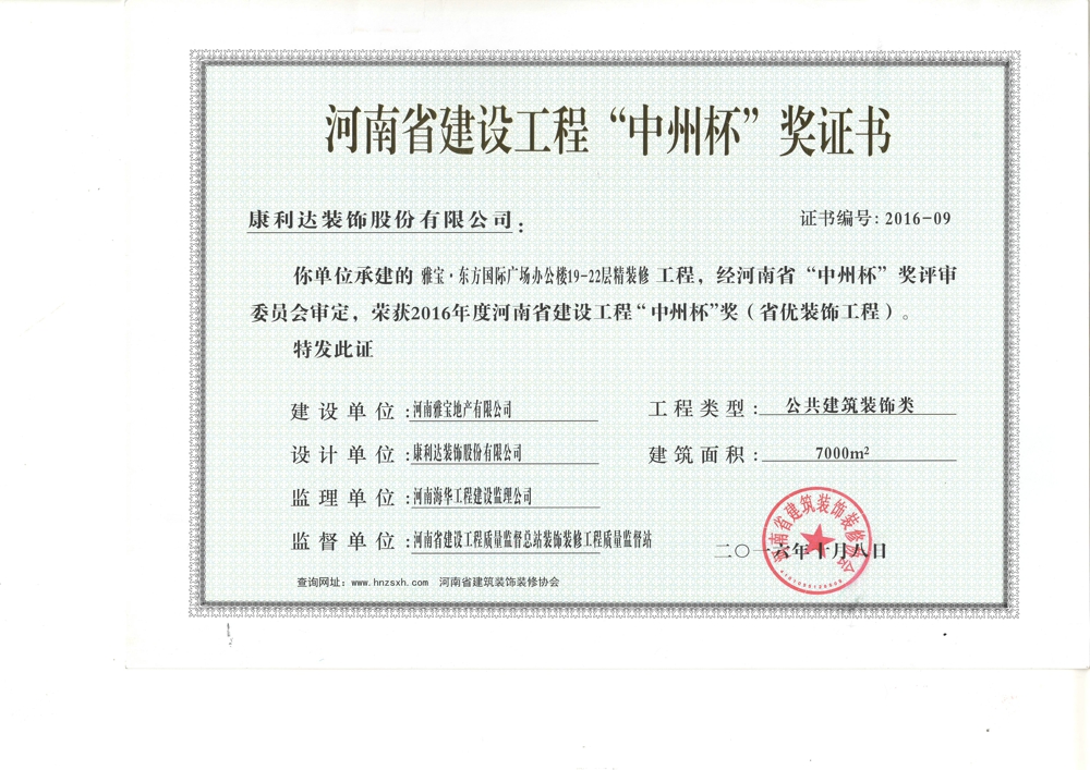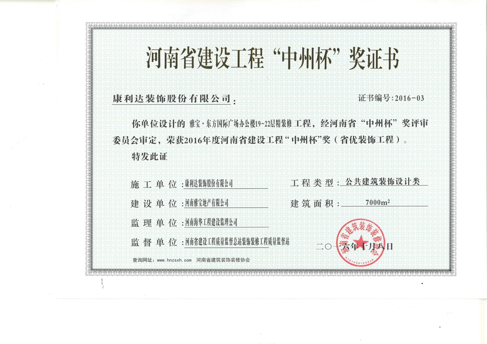 2016年度省“中州杯”奖 (承建)雅宝·东方国际广场办公楼19-22层精装修