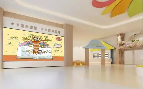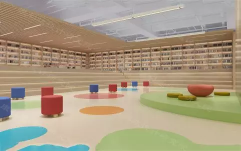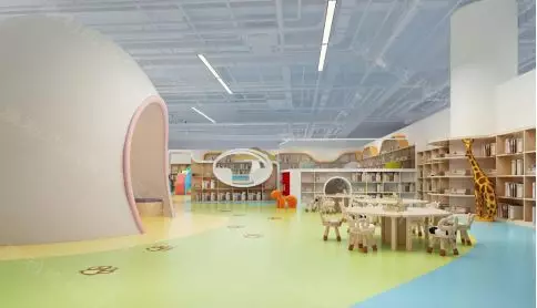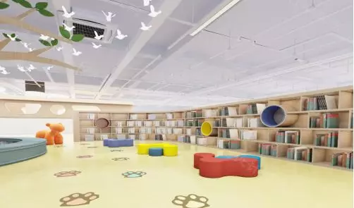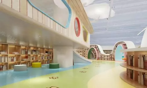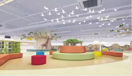 顶部天花造型采用图书馆的标志作为设计元素,以灵动的设计手法创造出自然、温馨、童趣的空间。