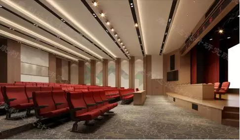 多功能厅的墙面材质由反射板、扩散板、吸音板组成,使得声音在空间中通过反射、扩散达到优异的音质效果,同时利用吸音板控制场内的混响时间。灯光设计分为演出模式、会议模式两个场景,分别满足演出和会议的需求。顶部采用穿孔铝板,在保持美观和层次感的同时,不会影响到原有的消防管道和空调。