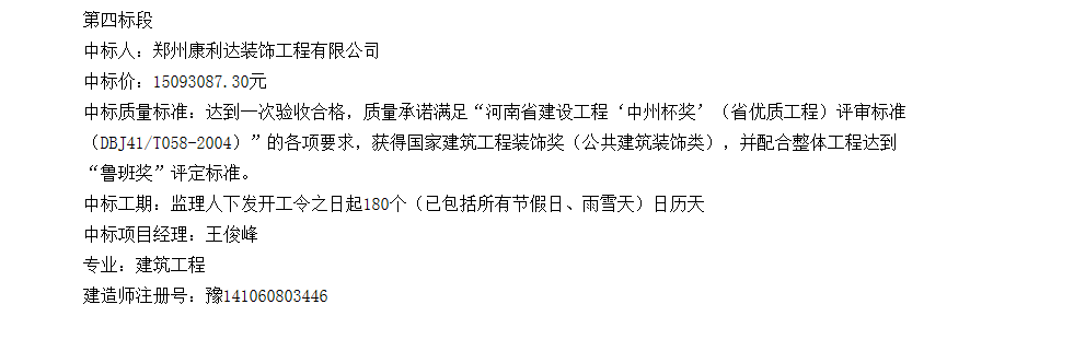 项目名称:中国建设银行股份有限公司河南省分行本部综合业务楼室内装饰装修工程第四标段