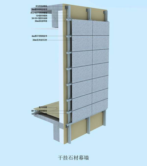 施工安全管理:通过对所有外立面装饰工程统一放基准线,根据幕墙施工图纸,进行后置埋件安装,主要是采用2根φ12*160的化学锚栓和2根φ12*120的膨胀螺栓对角安装。对于砖墙体则采用穿墙螺栓,并使用镀锌铁板锚固。