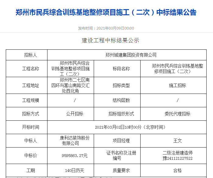 2021年3月9日,河南省电子招投标公共服务平台发布公告,康利达装饰股份有限公司作为第一中标人“C位”中标。