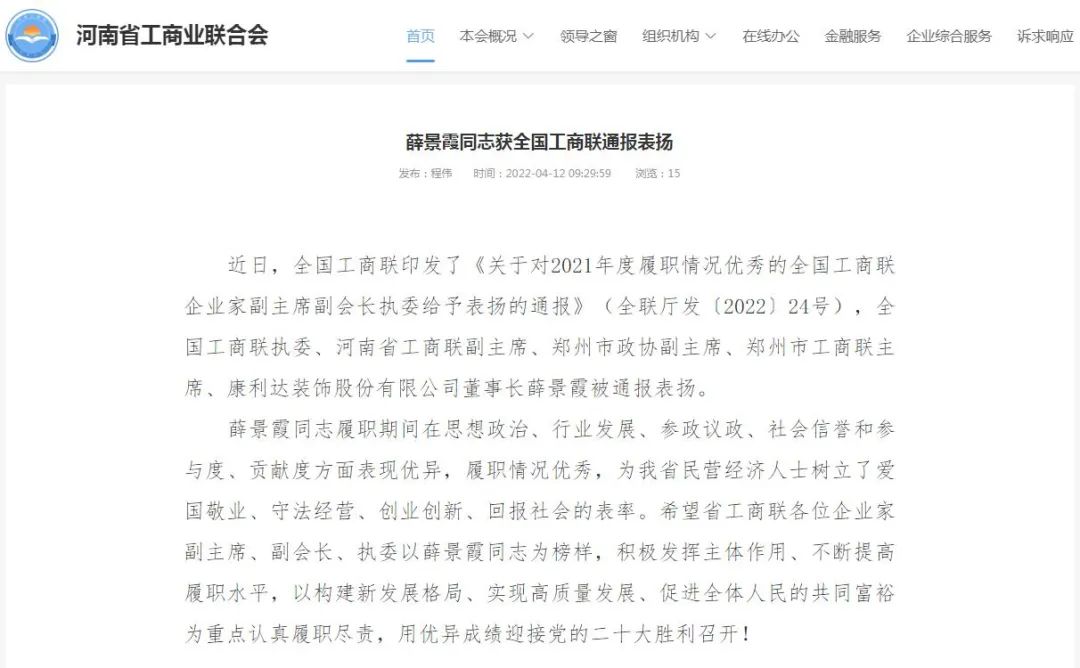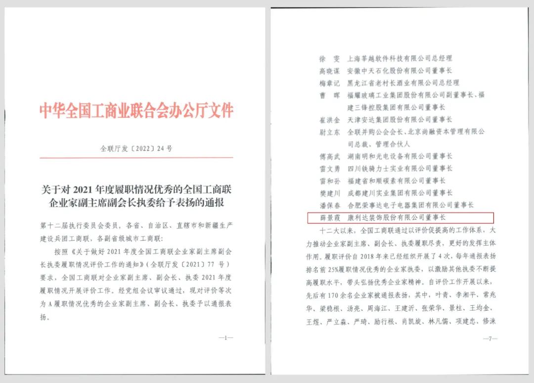 近日,全国工商联印发了《关于对2021年度履职情况优秀的全国工商联企业家副主席副会长执委给予表扬的通报》(全联厅发(2022)24号),对履职情况优秀的企业家副主席、副会长、执委给予表扬。全国工商联执委、河南省工商联副主席、郑州市政协副主席、郑州市工商联主席、康利达集团董事长薛景霞被通报表扬。