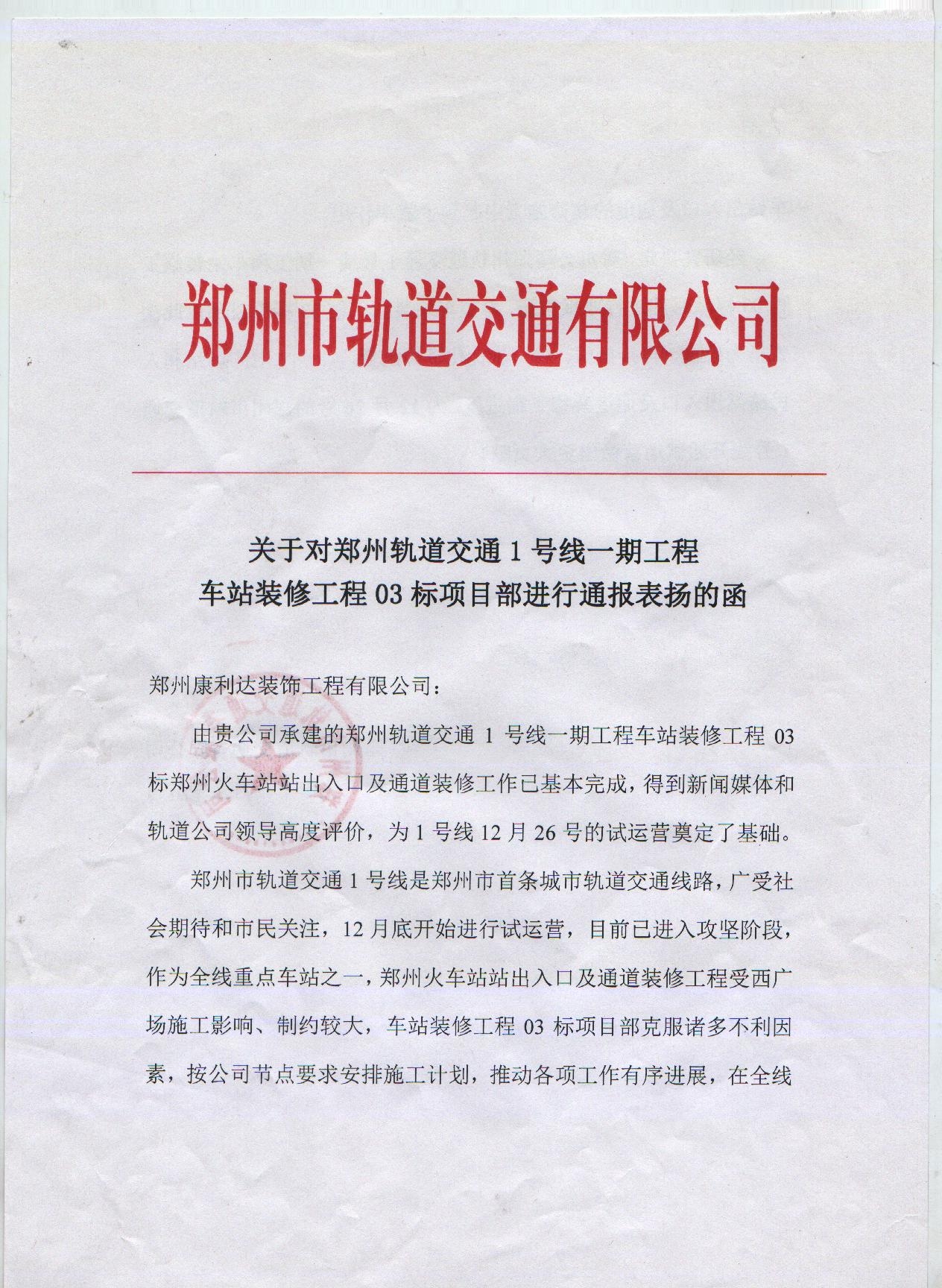 郑州康利达装饰工程有限公司承建的郑州市轨道交通1号线03标段装饰工程受到郑州轨道交通有限公司通报表扬。