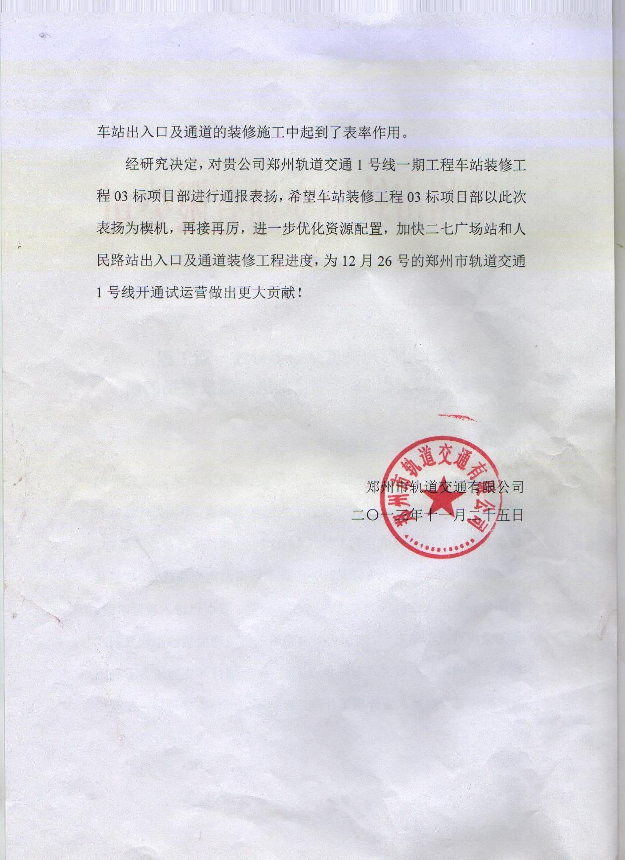 祝贺由我公司承建的郑州地铁1号线一期工程车站装修工程03标段得到郑州市轨道交通有限公司通报表扬