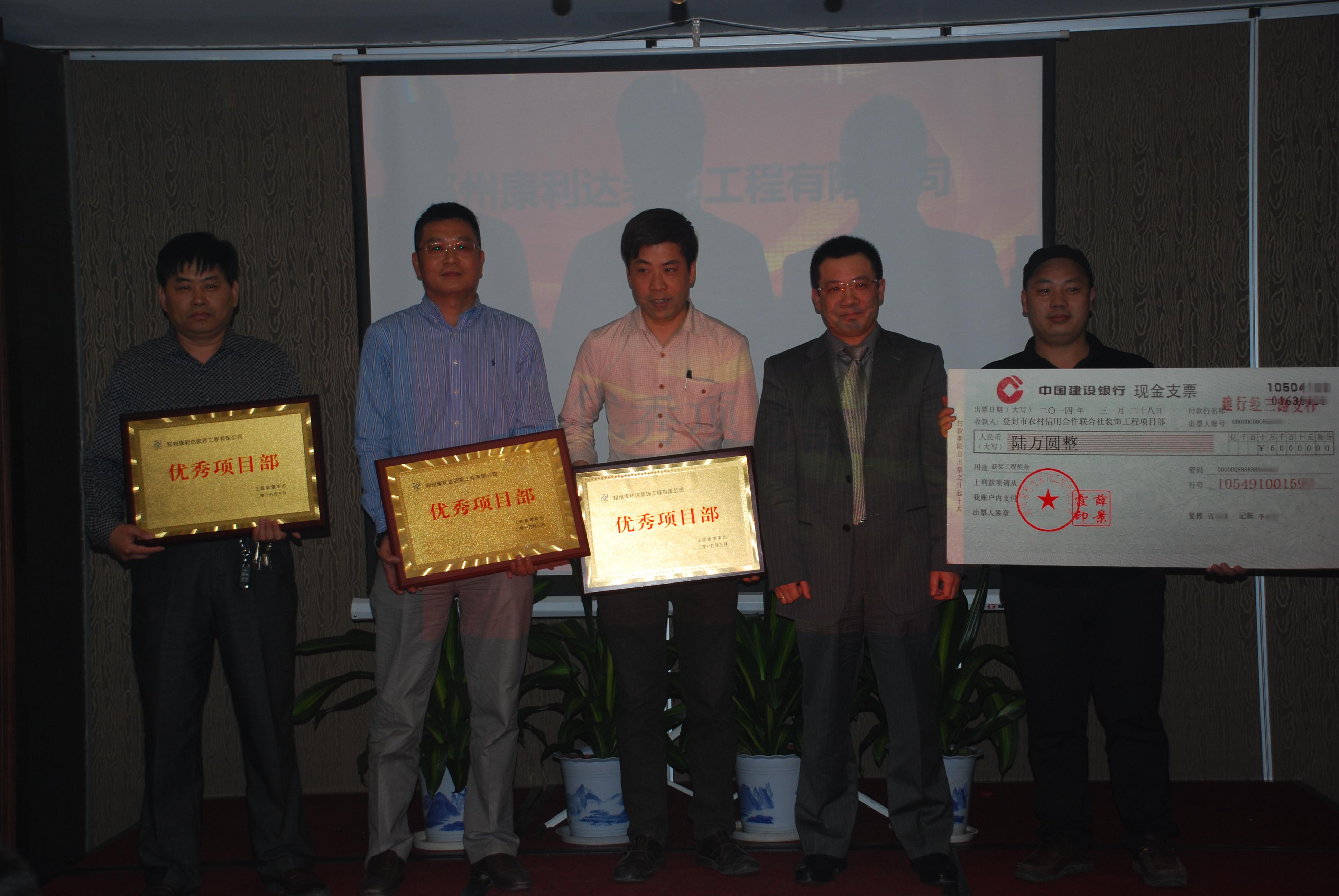 在现场,公司对荣获“省优中州杯奖”和“全国建筑工程装饰奖”的登封市农村信用合作联社工程的项目经理颁发特别奖励,中共方城县委党校综合楼装饰装修工程项目部、南阳邓州市驰诚检测服务大厅室内外装修工程项目部、巩义市人民检察院技术通讯大楼装饰工程项目部获“优秀项目部”荣誉称号。