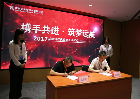 会议的召开赢得了广大合作伙伴朋友的高度评价,也得到了大家的热烈响应,他们对康利达装饰多年来取得成绩予以肯定和赞许。公司执行总经理徐新明与多家材料商签订了长期战略合作协议,他们表示,将与康利达诚信合作,并肩前进,共赢未来。