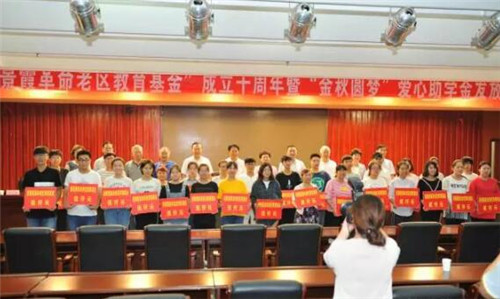 2017年8月25日,“薛景霞革命老区教育基金”现场发放爱心秋助学金8万元,资助28名革命老区贫困大学生入学