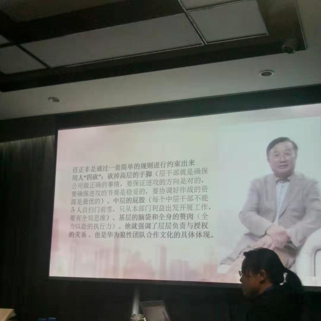 在培训中,叶总还引用了华为创始人任正非的企业管理理念:砍掉高层的手脚,砍掉中层的屁股,砍掉基层的脑袋和全身的赘肉.任正非强调,层层负责与授权的关系,也是华为狼性团队合作文化的具体体现.