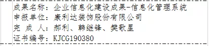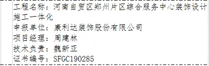 经过行业专家初审、省协会推荐、专家组终审等相关程序,我公司承建工程“河南自贸区郑州片区综合服务中心装饰设计施工一体化”入选“科技示范工程”名单,我公司“企业信息化建设成果-信息化管理系统”入选“科技创新成果”名单。