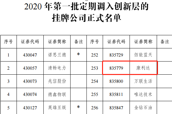 2020年5月22日,全国中小企业股份转让系统有限责任公司在官网发布《关于发布2020年第一批市场层级定期调共计502家企业成功脱颖而出进入新三板创新层,康利达装饰(股票代码:835779)位列其中,本次市场层级定期调整决定自2020年5月25日起生效。
