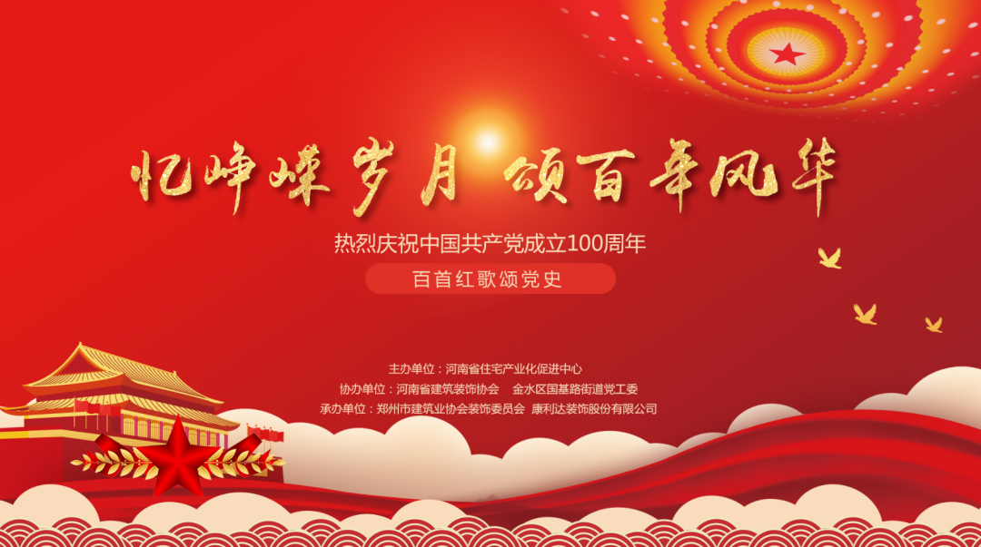 七月的天空流光溢彩,七月的党旗鲜艳飘扬。为庆祝中国共产党成立100周年,颂扬党的光辉历程,讴歌党的丰功伟绩,厚植爱党爱国情怀,弘扬社会主义核心价值观,展示建筑装饰行业的精神风貌,激励行业积极向上乐观进取的精神。2021年6月29日下午,由河南省住宅产业化促进中心主办,河南省建筑装饰协会、金水区国基路街道党工委协办,郑州市建筑业协会装饰委员会、康利达装饰股份有限公司承办的“忆峥嵘岁月,颂百年风华——百首红歌颂党史”红歌比赛在河南建筑职业技术学院礼堂隆重举行。