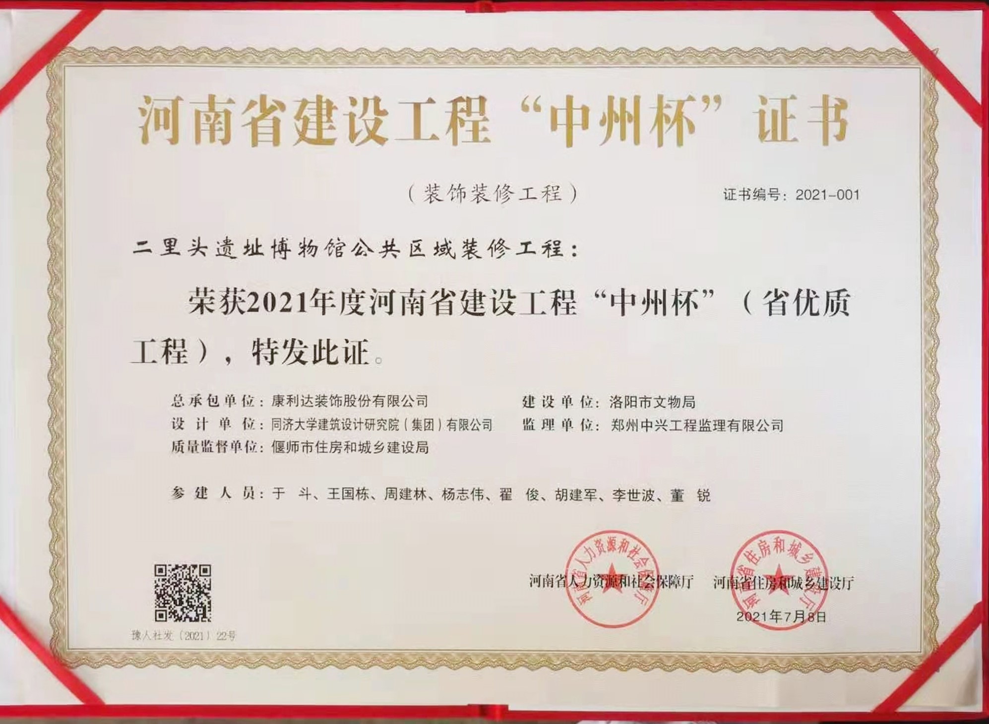 近日,由康利达装饰股份有限公司承建的洛阳二里头夏都遗址博物馆装饰装修工程项目,从众多参选项目中脱颖而出,荣获“2021年度河南省建设工程中州杯(省优质工程)奖”,同时也是此次中州杯“装饰装修工程”组别唯二入选的工程项目之一。“中州杯”奖由河南省住房和城乡建设厅与河南省人力资源和社会保障厅联合组织专家评选,每年评选一次,是河南省建设行业工程质量的最高荣誉奖项。