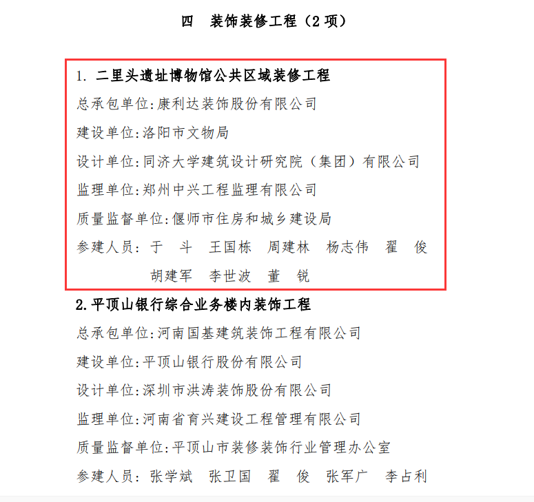 此次二里头博物馆项目获此殊荣,既是行业领导专家对康利达装饰整体实力的认可,同时也激励着康利达人不断前进、再创辉煌。未来,康利达装饰将继续发挥示范带头作用,坚守匠心精神,强化质量管理,继续争创精品工程,在促进河南装饰装修行业改革发展、推动区域生态环境发展方面做出新的更大的贡献。