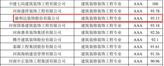 此次康利达装饰获评AAA级企业建筑装修装饰工程专业第三位,不仅代表着行业对康利达装饰在装修装饰领域的综合素质、管理能力、财务能力、服务能力、信用表现和经营实力的全面认可,也为康利达装饰在装修装饰领域扩大市场竞争力、提高经营水平提供了依托和支撑,同时也彰显了康利达装饰在河南省乃至全国装饰行业的地位。
