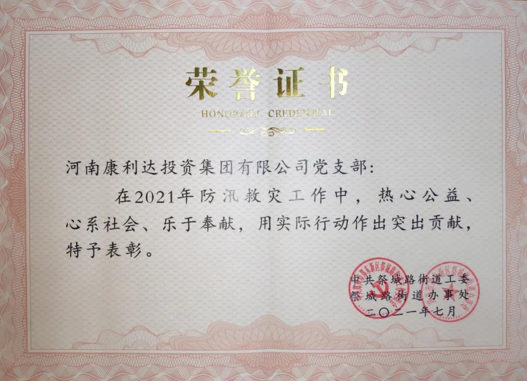 近日,祭城路街道办事处对2021年防汛救灾工作表现突出、热心公益、心系社会的党支部进行表彰。康利达集团党支部获得表彰。