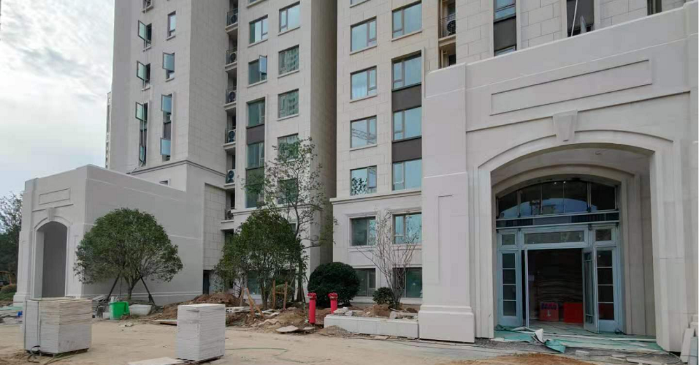 本项目采用的是天然石材(葡萄牙米黄),处理色差就是我们要面临的最大难题之一。万科民安江山府幕墙石材颜色整体为浅色系的米白色,浅色石材幕墙对石材本身的品质要求非常苛刻,若想提高本项目的品质,石材色差控制就成了项目部工作的重中之重。