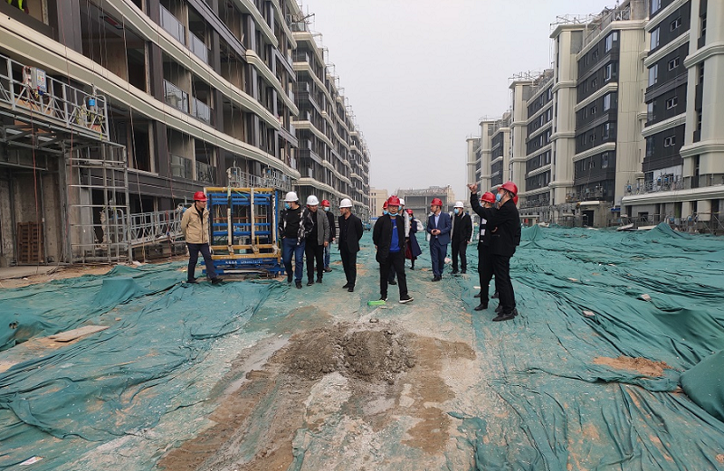 我司主要承建该项目叠墅区公区精装修及成品房批量精装修工程,徐总一行首先参观了鸿园银杏苑项目的整体建设情况和工程进度,听取了项目经理关于项目施工进度、安全质量、现场管理、施工工艺、项目疫情防控等情况汇报。