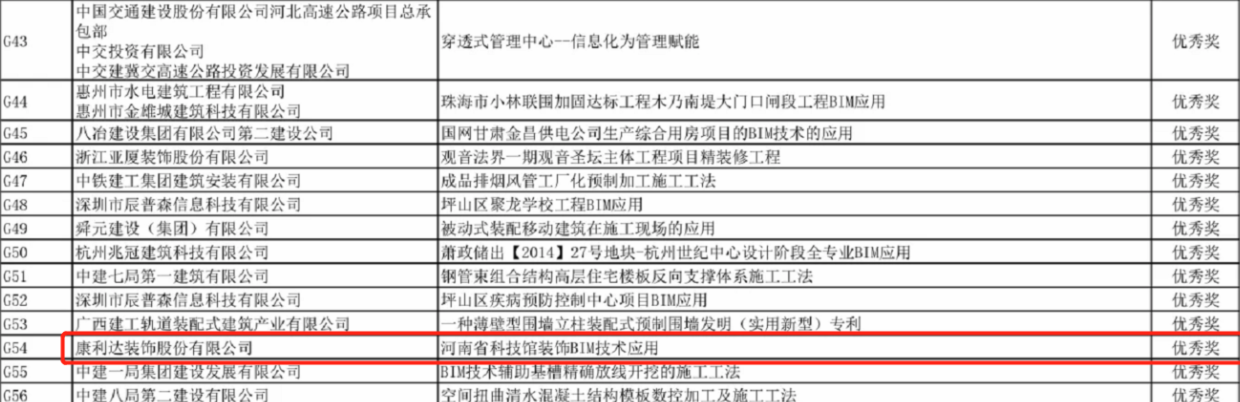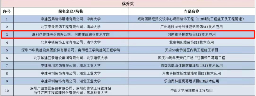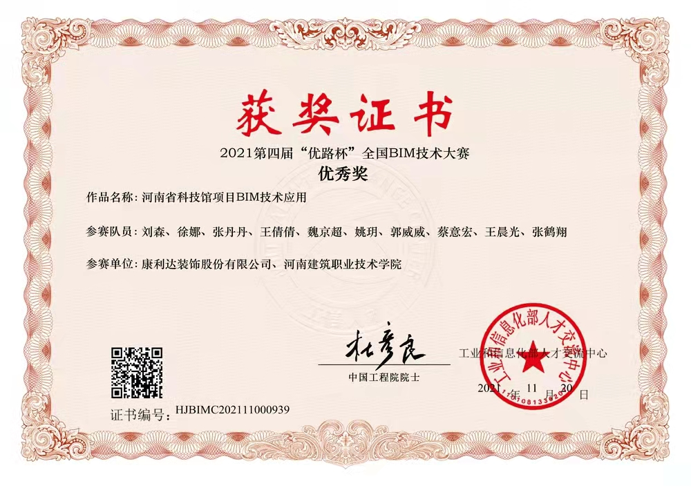 由国家工业和信息化部人才交流中心主办、中国工程院院士参与评审的第四届“优路杯”全国BIM技术大赛获奖名单公示,康利达设计院参赛作品《河南科技馆装饰BIM技术应用》荣获“优秀奖”。