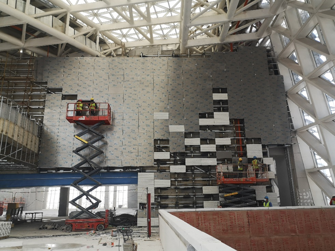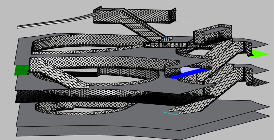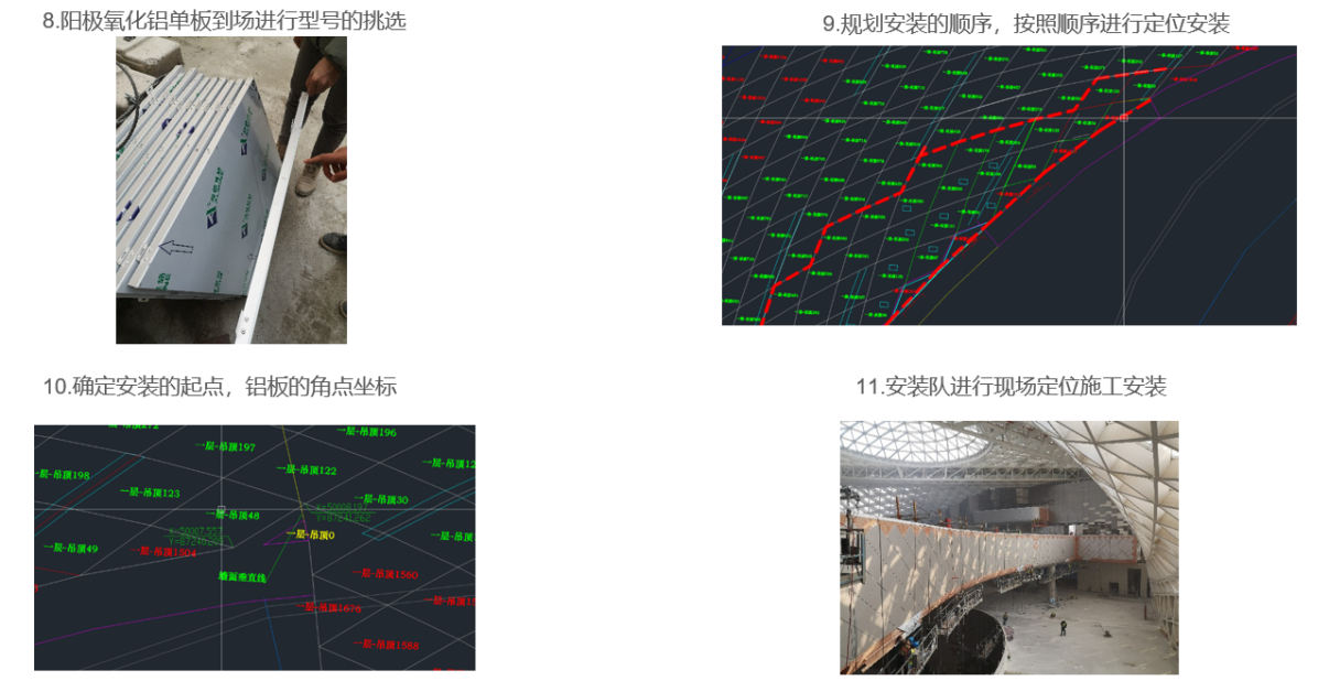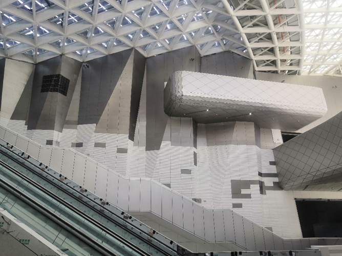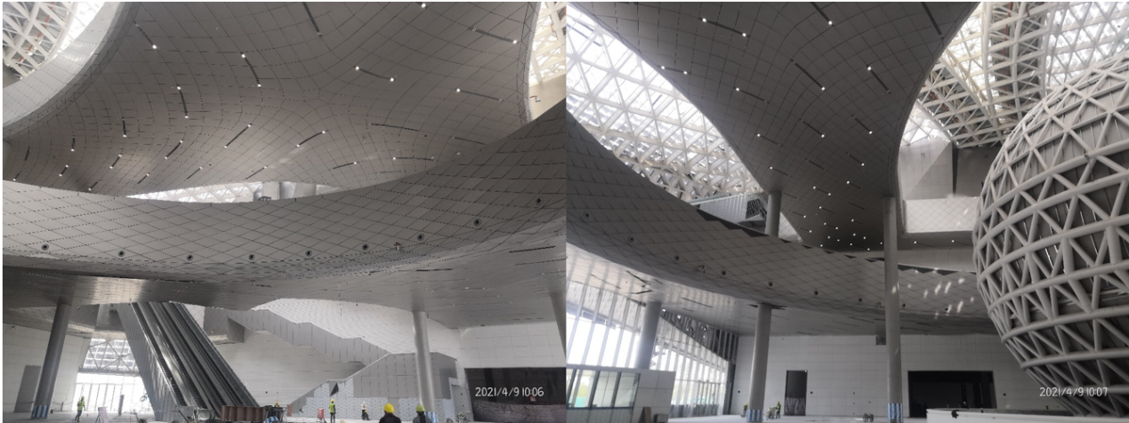 该项目大规模采用异形吊顶,材质为阳极氧化铝单板,多为空间结构,定位难度大,施工要求的精度高。采用传统的施工方法,很难在施工精度上满足现场需求,BIM技术和施工测量的集成可以大大降低控制测量的难度,提高施工精度,缩短了工期。可以更加清晰的把设计方案与设计修改展现给甲方,对全部施工测量方案更加客观与立体的进行测评,根据BIM建立的三维数据模型现场指导施工测量。